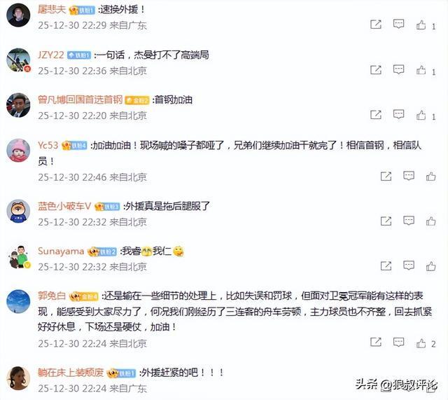 場場讓趙睿周琦那麽打怎麽可能呢!!天南地北的三連客場,再加上連續三場高強度比賽,確實要累死了….期待下場阿基和小曾的回歸!再說一萬遍既然爭冠是目標,那外援問題就是重中之重!別浪費那麽好的國內球員!最後希望大家2026年健健康康,一定能拚到那個冠軍。