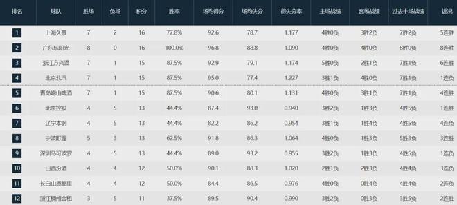未嚐敗績的廣東隊8勝0負緊隨上海隊後麵,衛冕冠軍廣廈隊7勝1負聯盟第三,北京隊戰績同樣為7勝1負位列第四,本賽季的CBA果然是四強鼎立,每隊都有足夠的陣容深度衝擊總冠軍。