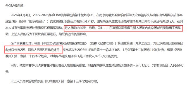 根據《中國男子籃球職業聯賽紀律準則》第四章第四十九條之規定,對山東高速隊主教練邱彪處以停賽2場、罰款人民幣5萬元的處罰,根據《紀律準則》第二章第二十四條之規定,對山東高速隊翻譯薛飛處以罰款人民幣2萬元的處罰。同時,依照本賽季CBA聯賽賽風賽紀責任人製度相關規定,對山東高速隊主教練邱彪追加處罰人民幣1萬元,對其罰款合計人民幣6萬元。