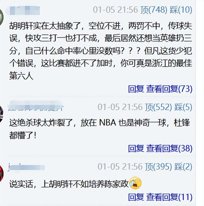 還有位球迷的長文點評說的特別真實且紮心:每次廣東上半場、前三節領先對手十幾二十分,之後上胡明軒就會被對手追上來;不管球隊輸贏,胡明軒的正負值幾乎都是負的,廣東基本領先大比分後上胡明軒,球隊都是輸分的,因為每球都是交給胡明軒為軸做進攻發起點,到最後時間走了大半,傳球幾乎毫無爆發力,還很隨意,隊友接球很不舒服,而且容易被斷。