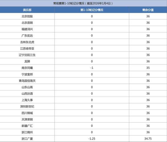 北京時間1月6日,CBA官方公布了截至1月4日,2025-2026賽季CBA聯賽常規賽青少年友好型賽場記分公示,浙江廣廈與南京同曦分別被記1.25分和1分。