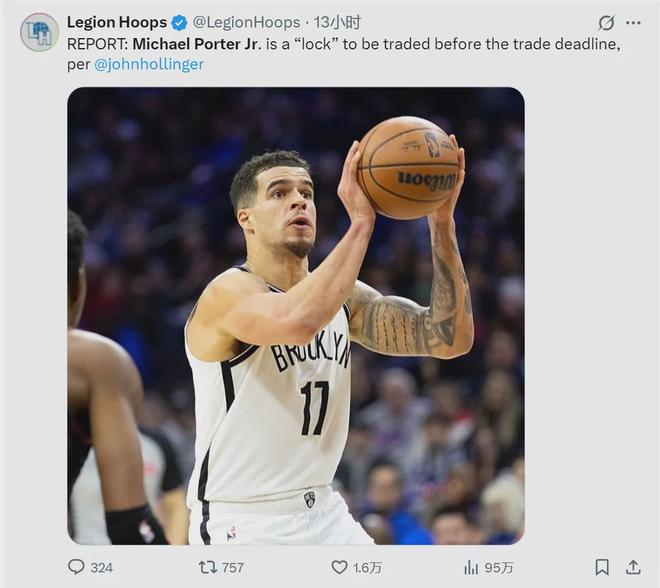 NBA名記John Hollinger報道,小邁克爾-波特在交易截止(2.6)日前被籃網送走是板上釘釘的事,籃網想要趁著小波特打出生涯最佳表現時,實現交易價值最大化。目前勇士、活塞和雄鹿都表達了興趣,其中最積極的就是勇士隊。