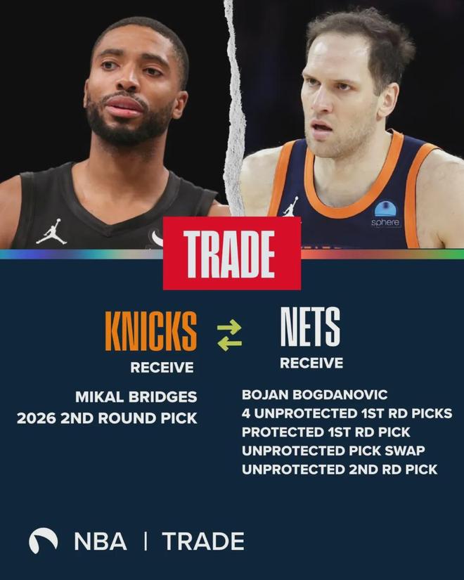2025年休賽期,掘金把小波特和2032年無保護首輪簽送給籃網,換來卡梅倫-約翰遜。如今籃網又想用小波特換首輪簽,這操作難免讓人想起布裏奇斯。當年籃網用杜蘭特換來大橋、約翰遜和4個首輪簽,又把大橋送到尼克斯,換來5個首輪簽。