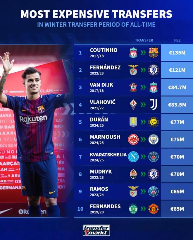 北京時間1月3日,德轉列出了冬窗曆史最貴的10筆交易,巴塞羅那在2018年冬窗1.35億歐元從利物浦引進庫蒂尼奧高居第一,切爾西2023年冬窗1.21億歐元從本菲卡引進恩佐-費爾南德斯排名第二,這也是冬窗曆史僅有的兩筆超過1億歐元的交易。