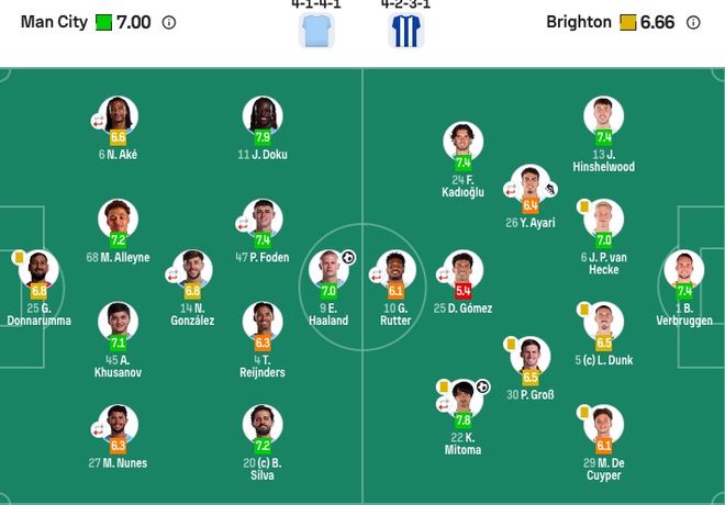布萊頓首發:1-維爾布魯根、5-鄧克、6-範赫克、29-德屈佩、24-卡迪奧盧、13-辛謝爾伍德、25-迭戈·戈麥斯(77'8-格魯達)、30-格羅斯、26-阿亞裏(83'20-米爾納)、10-魯特爾(77'18-維爾貝克)、22-三笘薰(83'14-沃特森)