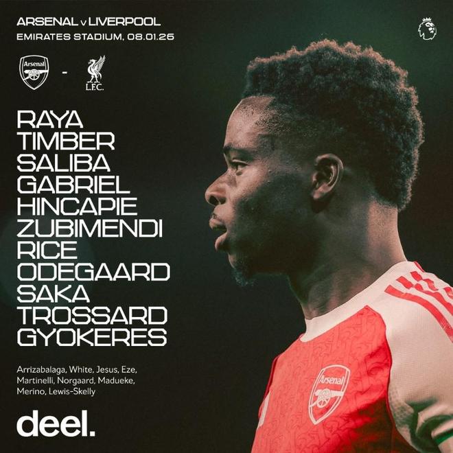 阿森納首發:1-戴維-拉亞、12-廷貝爾、6-加布裏埃爾、2-薩利巴、5-因卡皮耶、36-蘇比門迪、41-賴斯、8-厄德高、7-薩卡、19-特羅薩德、14-哲凱賴什