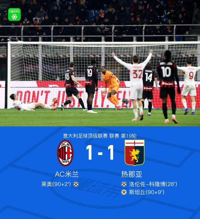 北京時間1月9日,意大利足球頂級聯賽第19輪,AC米蘭坐鎮主場迎戰熱那亞。上半場,科隆博弑舊主,福法納麵對空門離奇滑倒。下半場補時階段,萊奧頭槌扳平比分。讀秒階段,熱那亞獲得點球,但是斯坦丘罰失。全場比賽結束,米蘭1-1熱那亞。