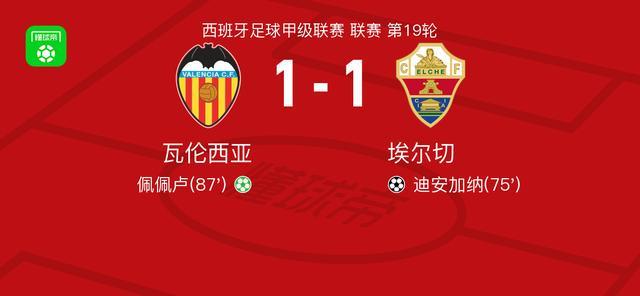 北京時間1月11日,西班牙足球甲級聯賽第19輪,瓦倫西亞主場迎戰埃爾切。比賽中,埃爾切由迪安加納接佩德羅薩助攻破門得分。隨後,瓦倫西亞由佩佩盧通過點球將比分扳平。最終雙方以1比1握手言和。