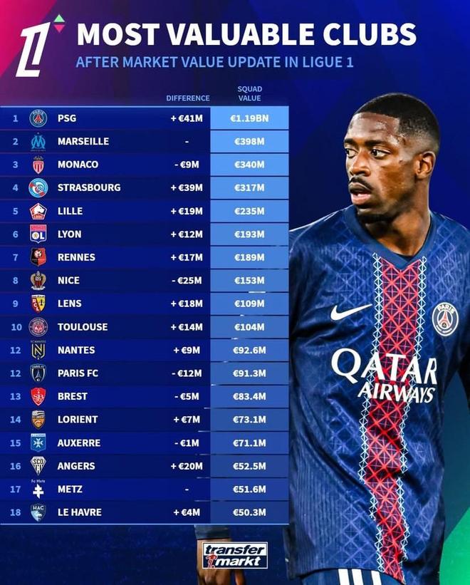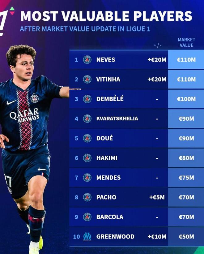 而另外的巴黎攻擊手包括杜埃、克瓦拉茨赫利亞和登貝萊的身價分別是9000萬到1億歐元,分列法甲的個人身價排行榜3到5位的。除了他們阿什拉夫·哈基米、努諾·門德斯、帕喬、巴爾科拉的身價為7000萬到8000萬,他們分列這6到10位的。也就是說整個法甲前10名有9名是巴黎隊員,由此可知,他們對這項賽事的統治的確是有根基的。