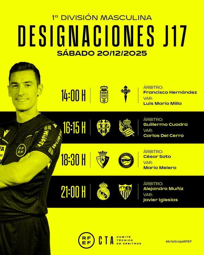 西班牙足協公布了聯賽第17輪第2比賽日的裁判名單,穆尼斯執法皇馬vs塞維利亞。